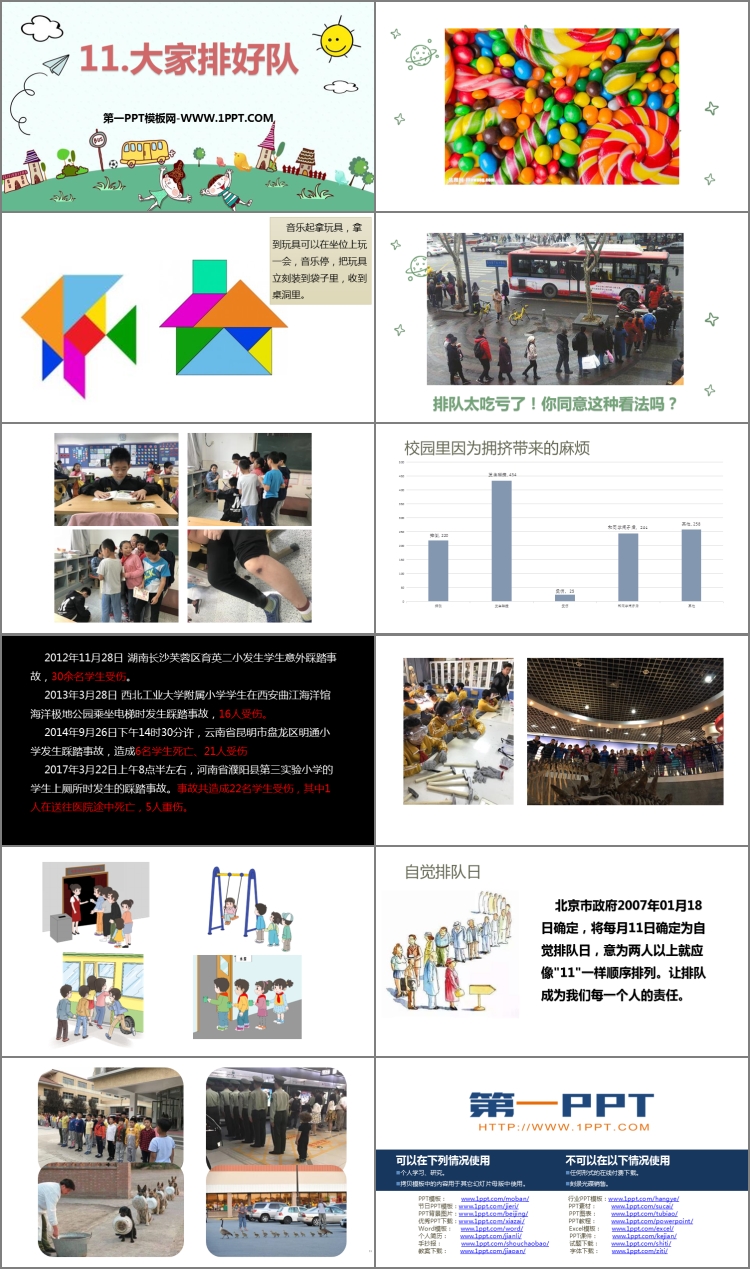 《大家排好队》PPT课件包含校园里因为拥挤带来的麻烦、自觉排队日等内容。
