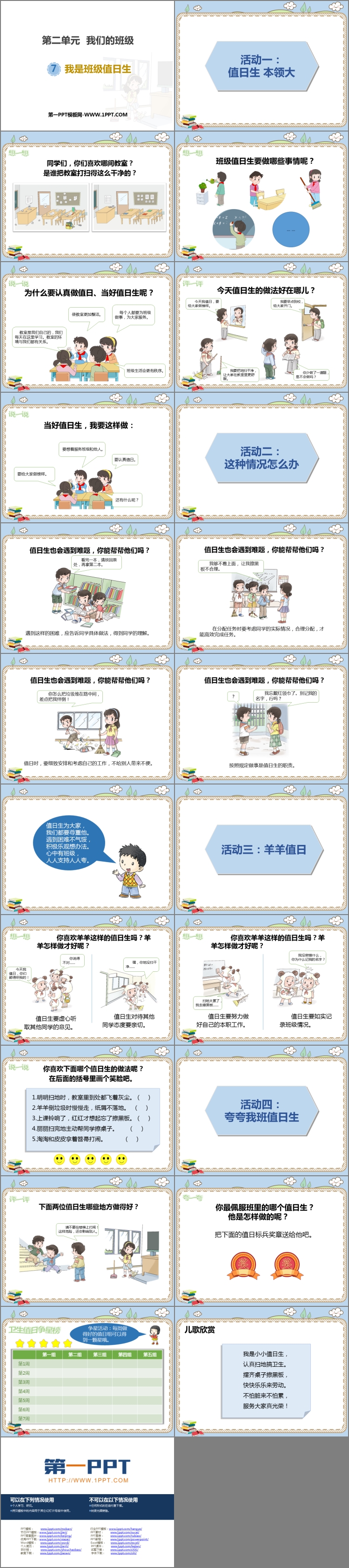 《我是班级值日生》PPT课件包含课堂活动、儿歌欣赏等内容。