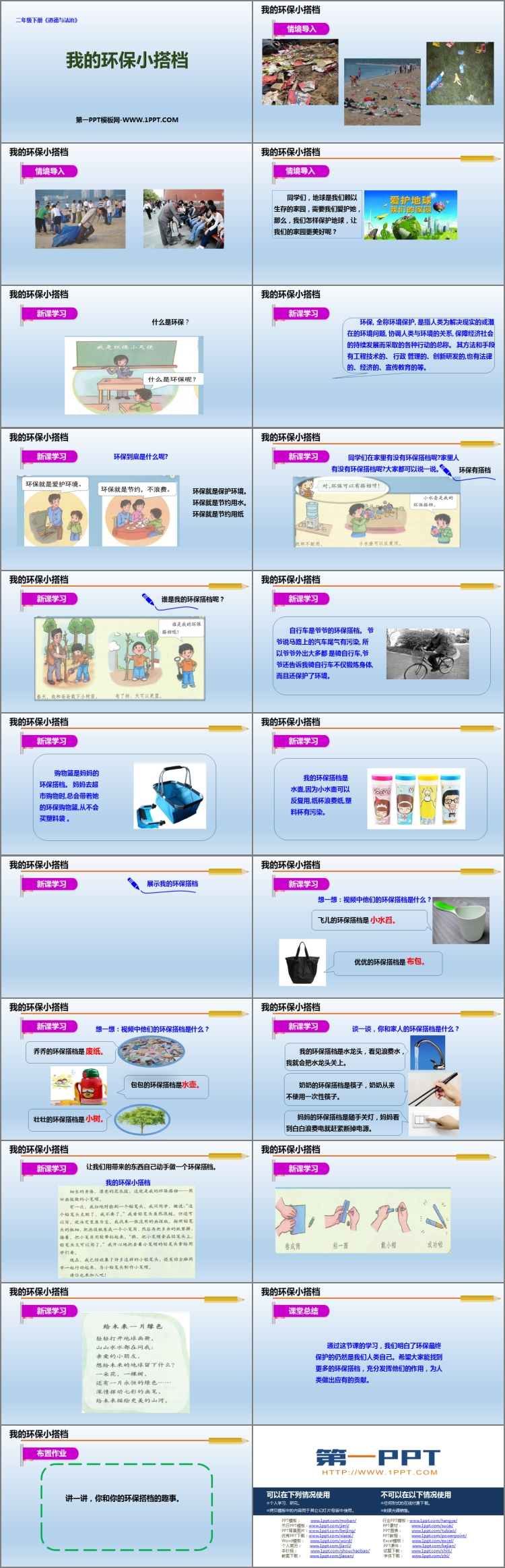 《我的环保小搭档》PPT课件包含情境导入、新课学习、课堂总结、布置作业等内容。
