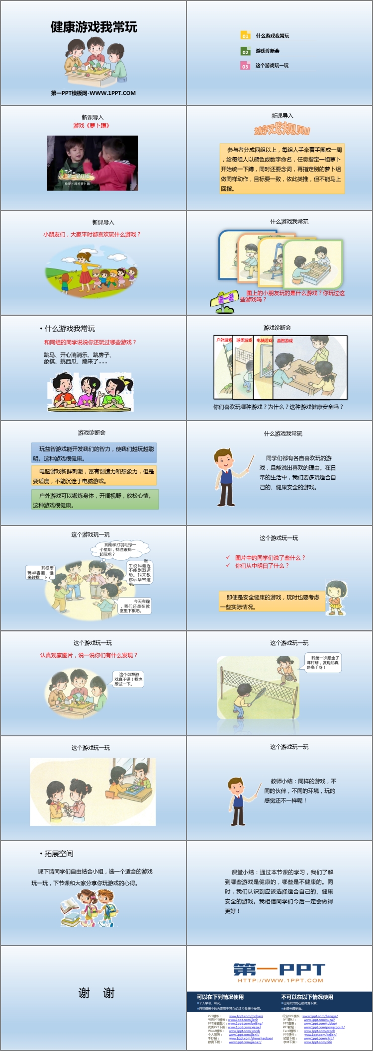 《健康游戏我常玩》PPT课件包含新课导入、游戏诊断会、拓展空间、课堂小结等内容。