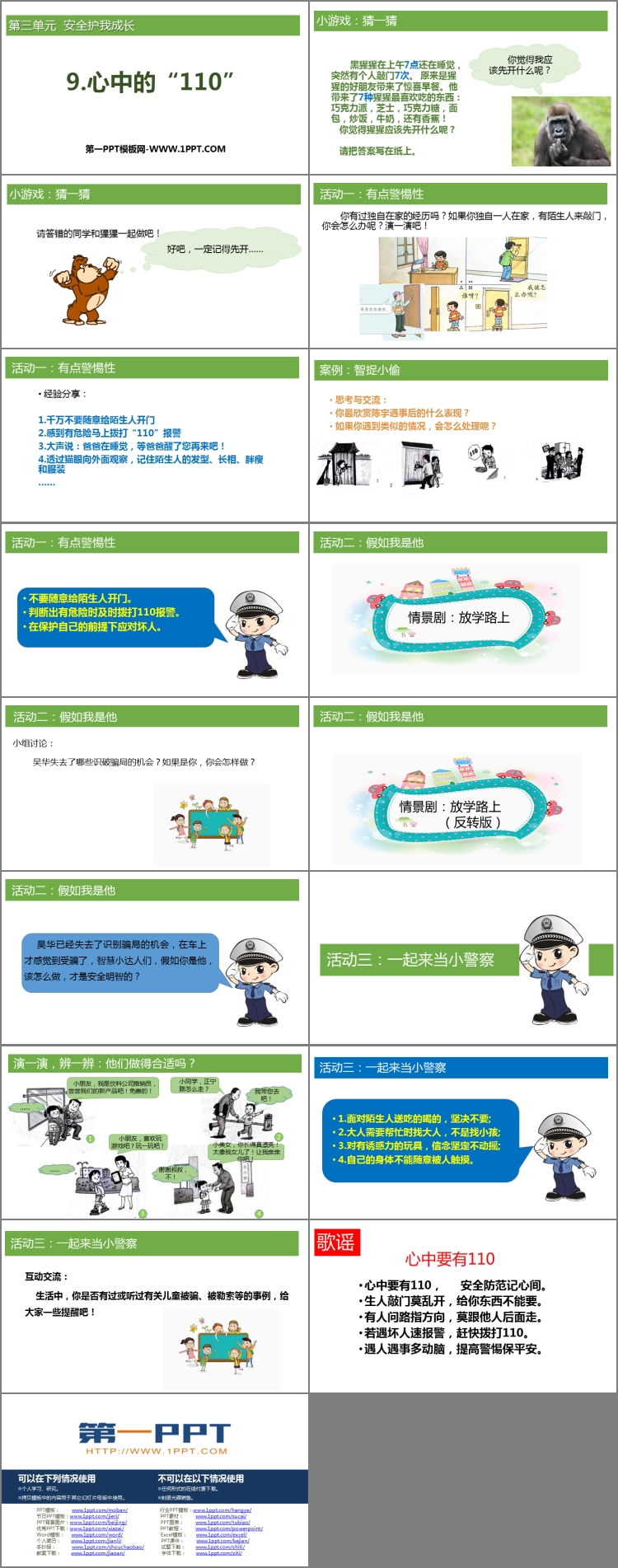 《心中的“110”》PPT课件包含课堂活动、歌谣赏析等内容。