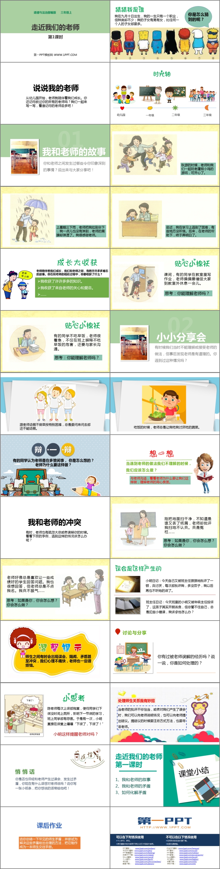 《走近我们的老师》PPT课件包含说说我的老师、小小分享会、我和老师的冲突、课堂小结等内容。