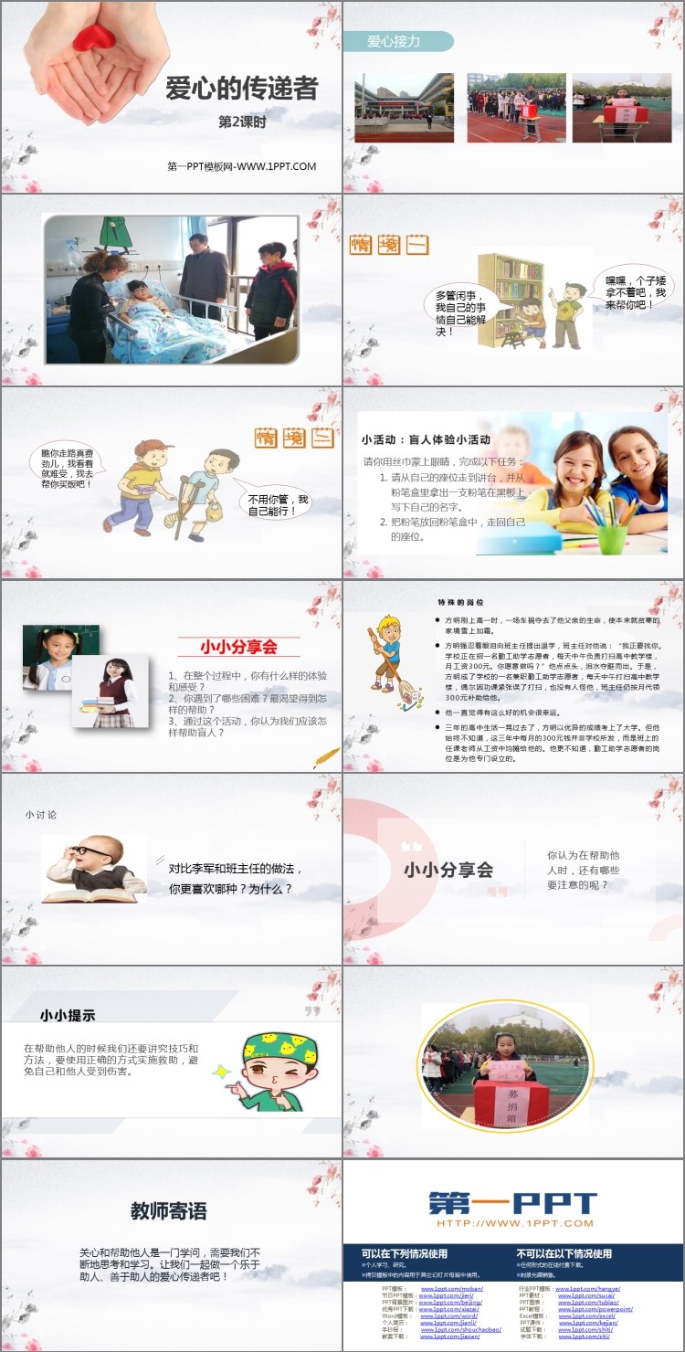 《爱心的传递者》PPT课件包含课堂活动、小小分享会、教师寄语等内容。