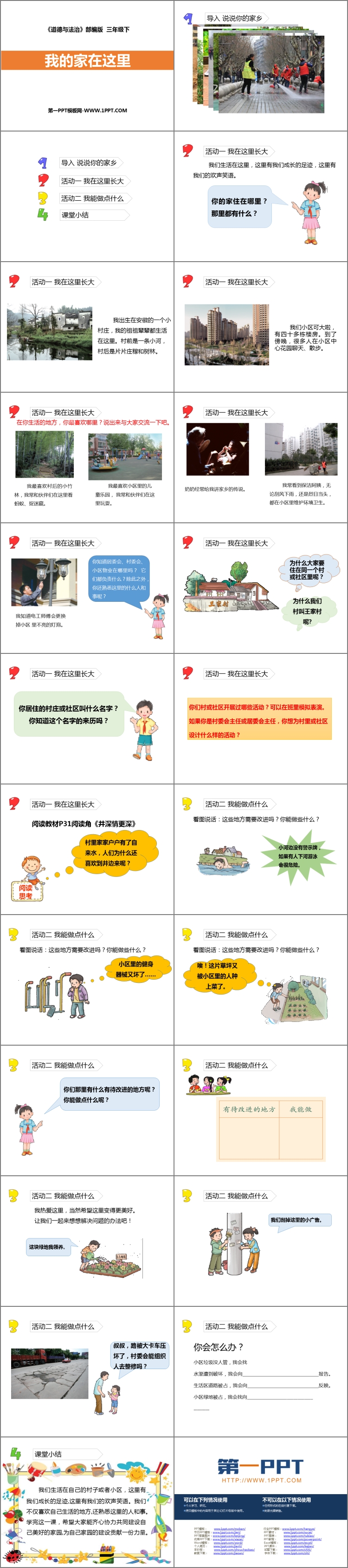 《我的家在这里》PPT课件包含导入说说你的家乡、课堂活动、课堂小结等内容。