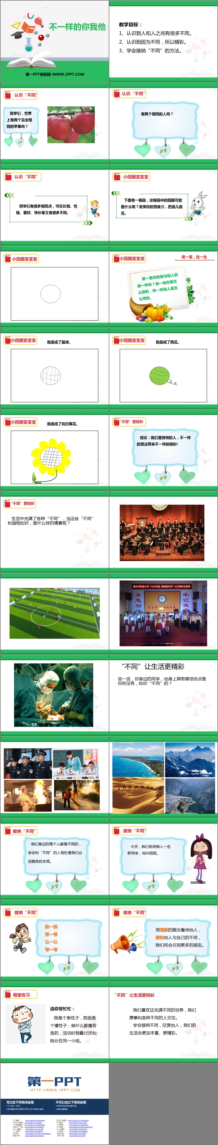 《不一样的你我他》PPT课件包含教学目标、认识“不同”、小圆圈变变变、“不同”更精彩、接纳“不同”、随堂练习等内容。