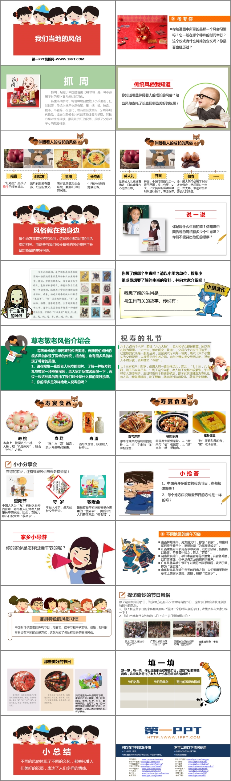 《我们当地的风俗》PPT课件包含考考你、传统风俗我知道、风俗就在我身边、尊老敬老风俗介绍会、各具特色的风俗习惯、小总结等内容。