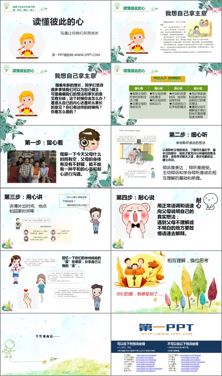 《读懂彼此的心》PPT课件包含我想自己拿主意、相互理解换位思考等内容。