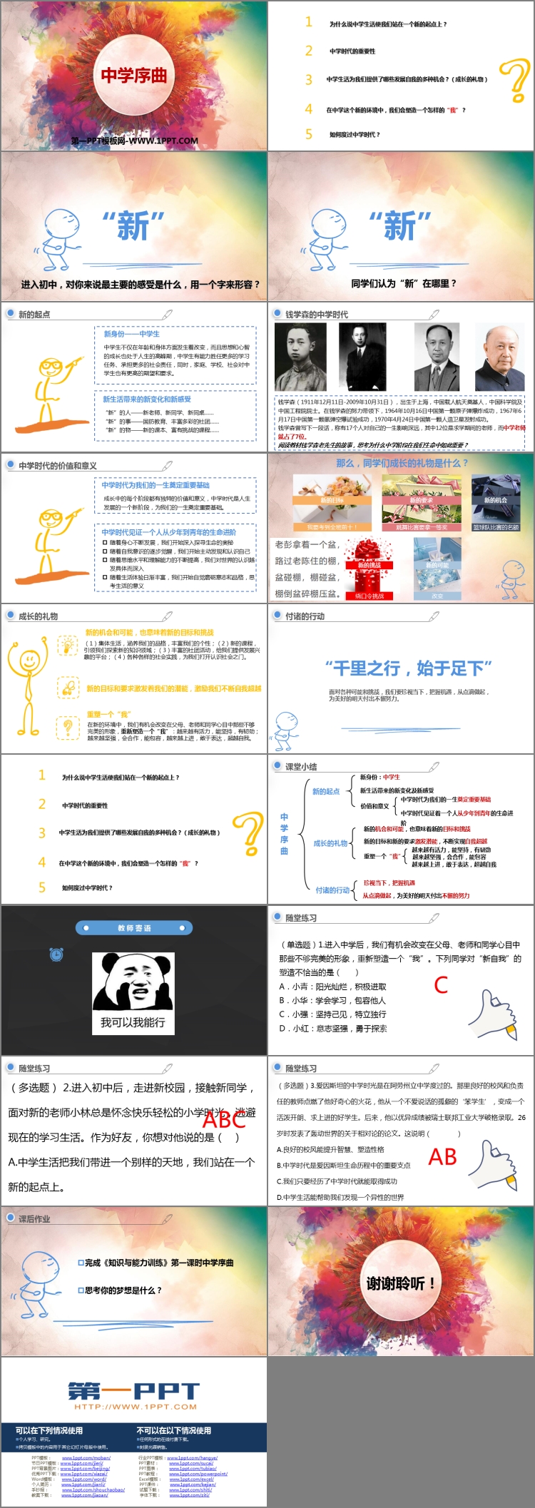 《中学序曲》PPT课件包含新的起点、成长的礼物、课堂小结、随堂练习、课后作业等内容。