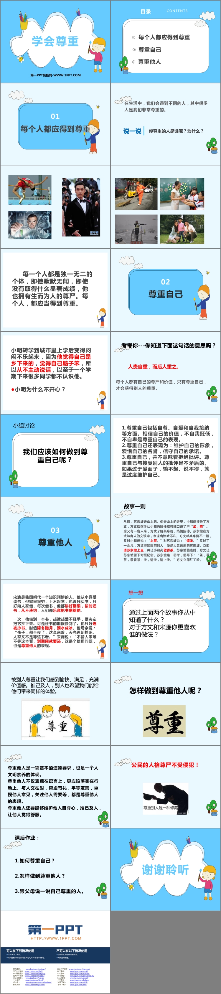 《学会尊重》PPT课件包含每个人都应得到尊重、尊重自己、尊重他人等内容。