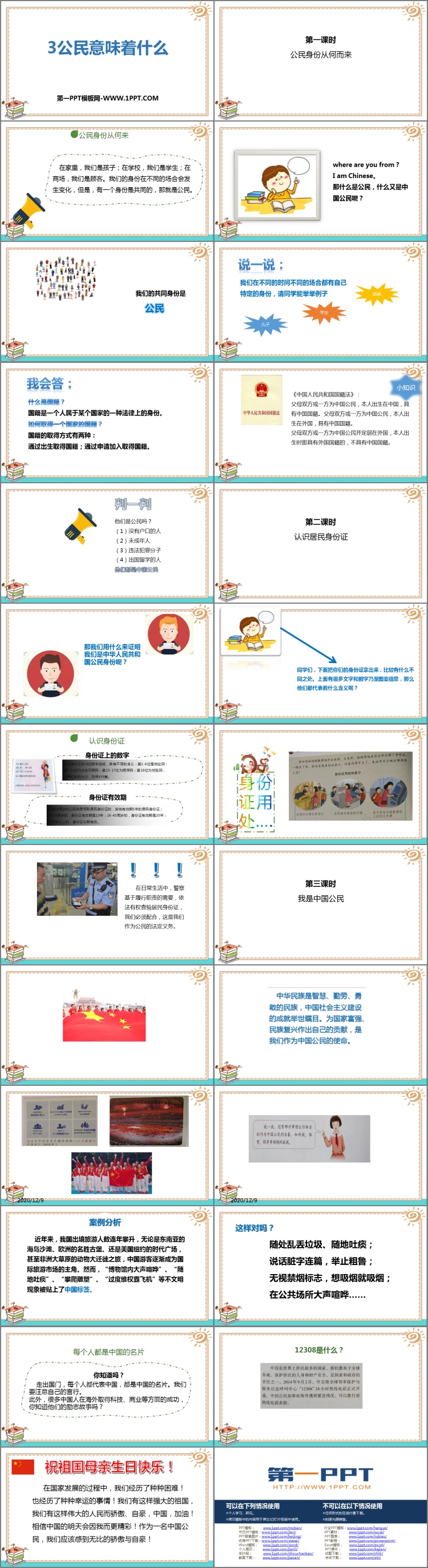 《公民意味着什么》PPT课件包含公民身份从何而来、认识居民身份证、我是中国公民等内容。