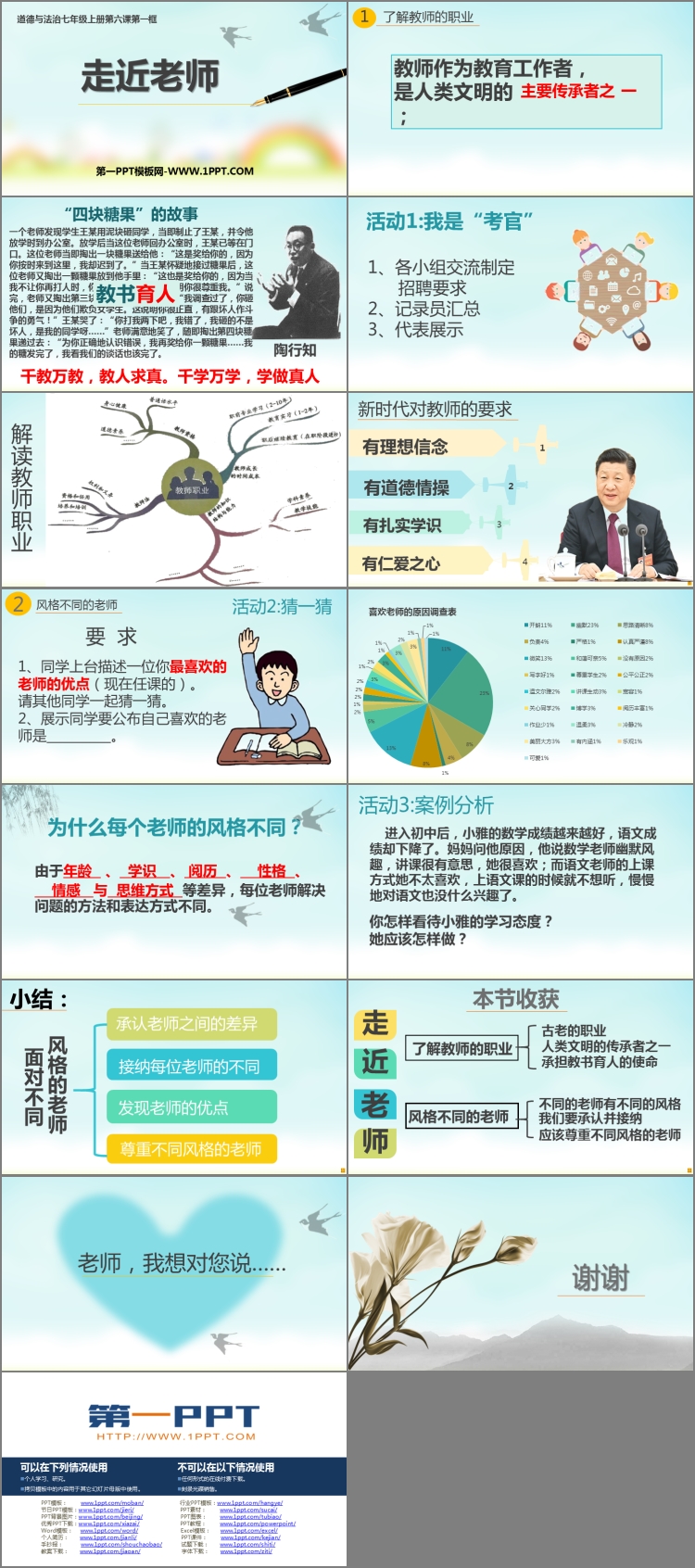 《走近老师》PPT课件包含了解教师的职业、风格不同的老师、小结、本节收获等内容。