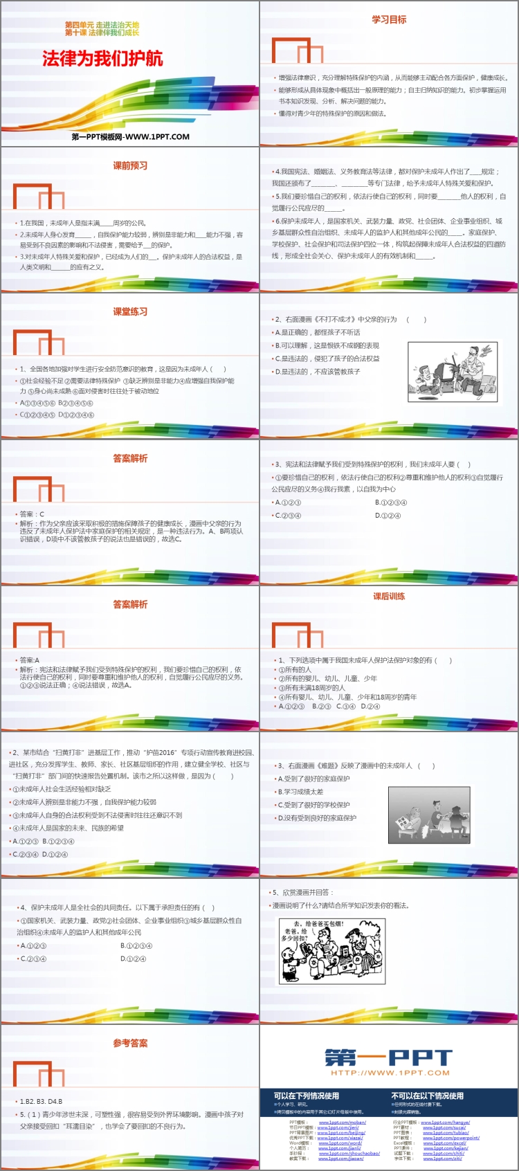 《法律为我们护航》PPT课件包含学习目标、课前预习、课堂练习、课后作业等内容。