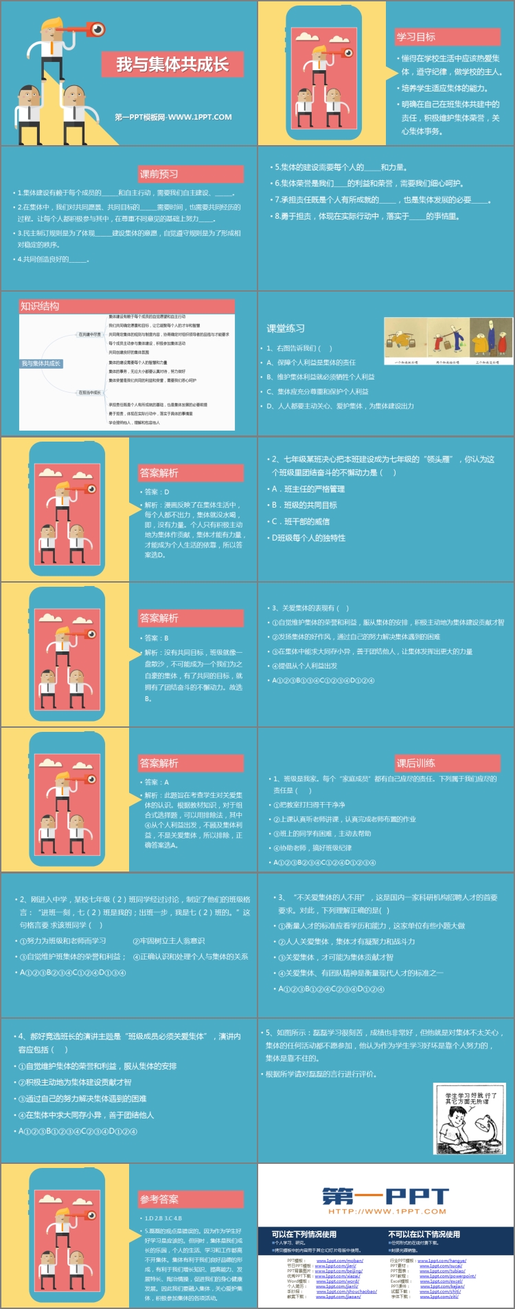 《我与集体共成长》PPT课件包含学习目标、课前预习、课堂练习、课后训练等内容。