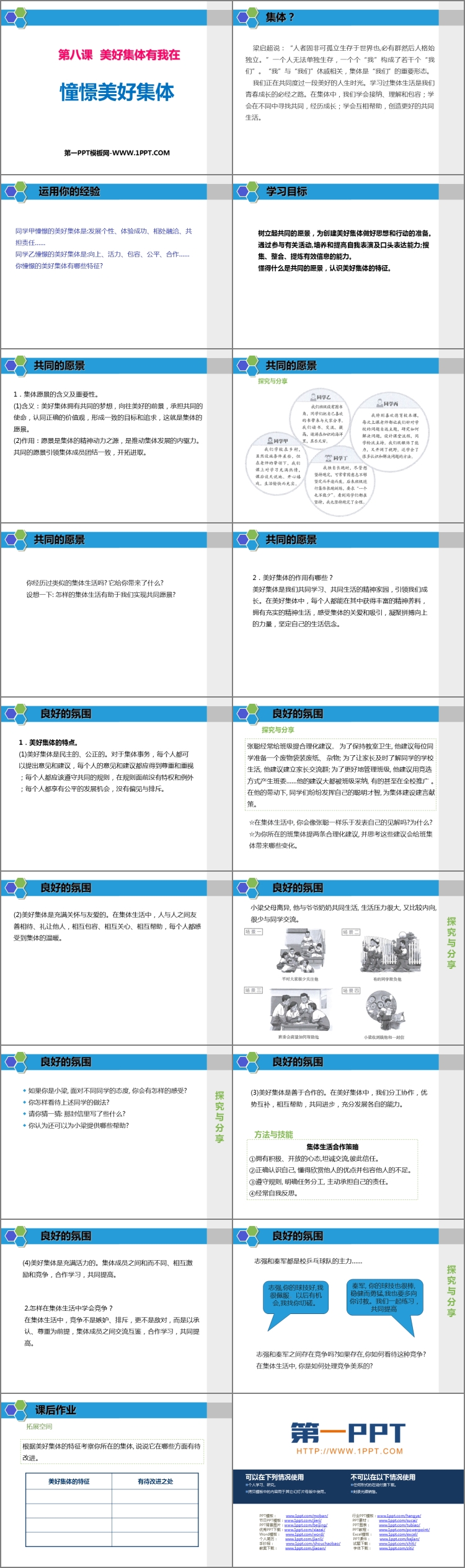 《憧憬美好集体》PPT课件包含学习目标、共同的愿景、良好的氛围、课后作业等内容。