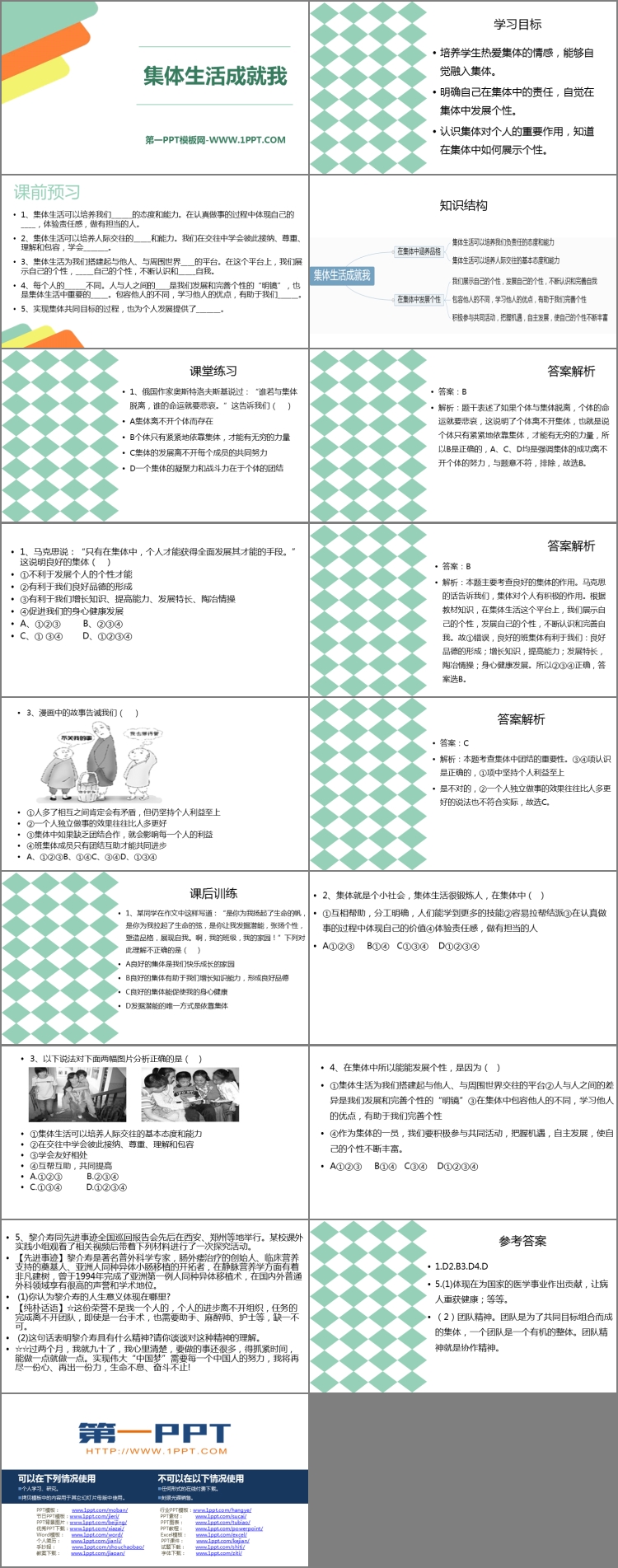 《集体生活成就我》PPT课件包含学习目标、课前预习、课堂练习、课后训练等内容。