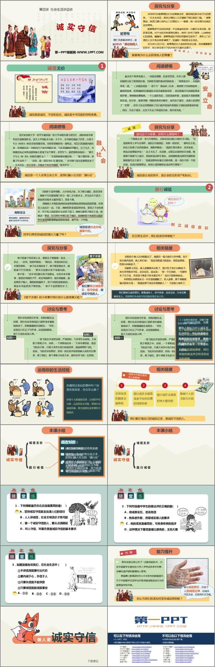 《诚实守信》PPT课件包含诚信无价、践行诚信、本课小结、随堂练等内容。
