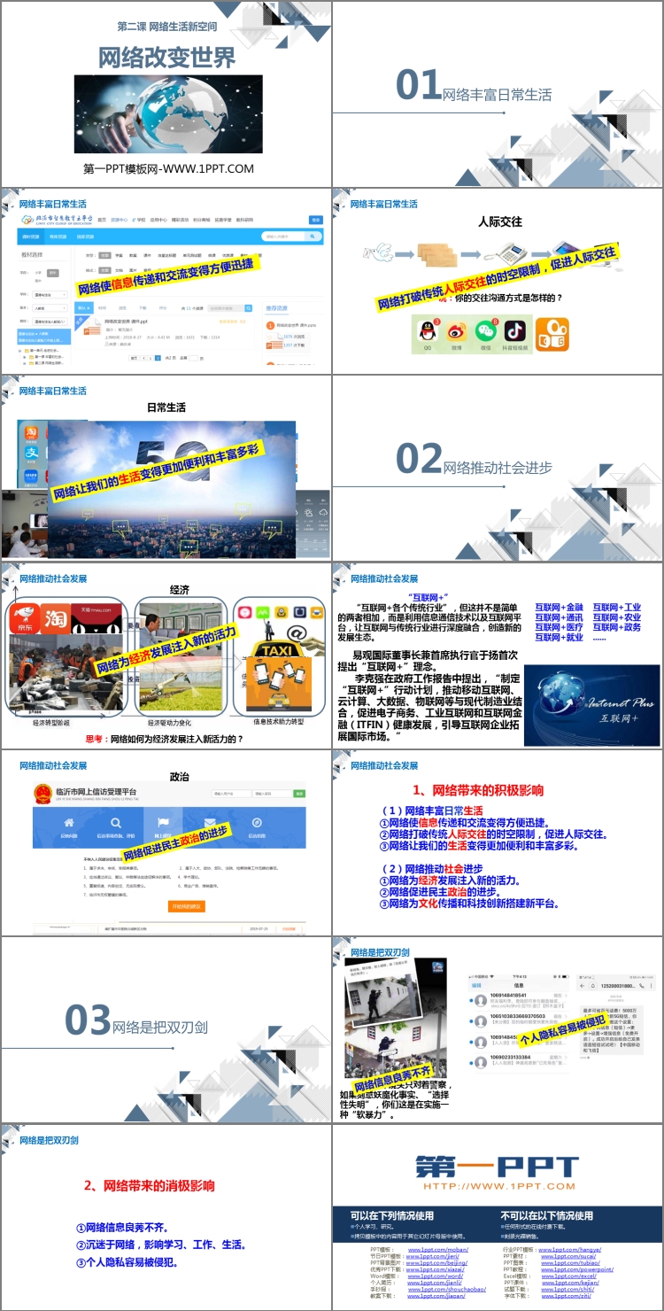 《网络改变世界》PPT课件包含网络丰富日常生活、网络推动社会进步、网络是把双刃剑等内容。