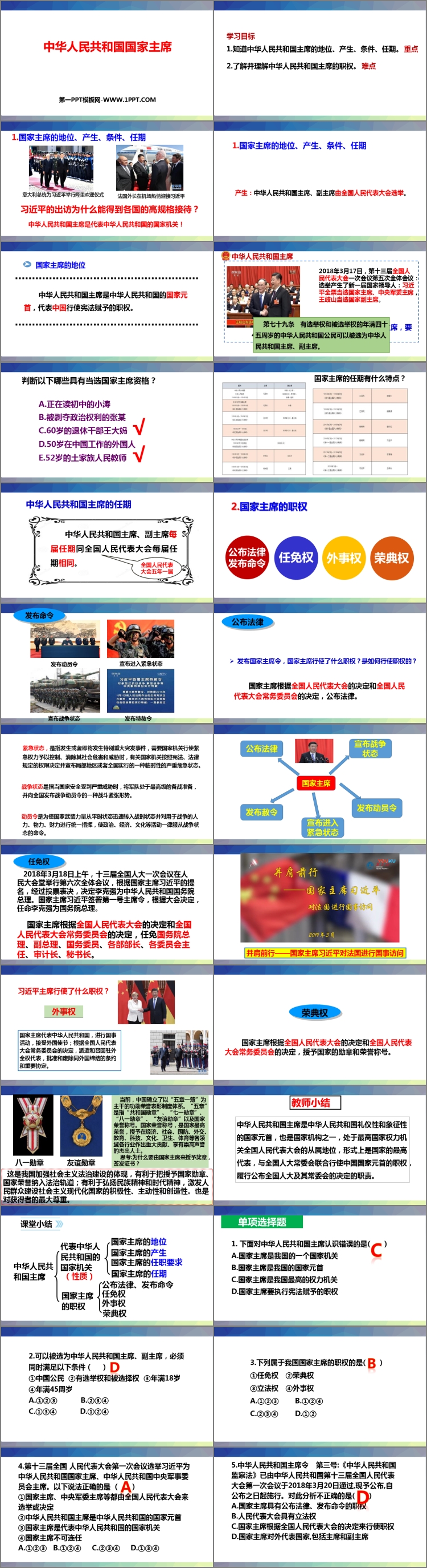 《中华人民共和国主席》PPT课件包含学习目标、新课解析、教师小结、课堂小结、单项选择题等内容。