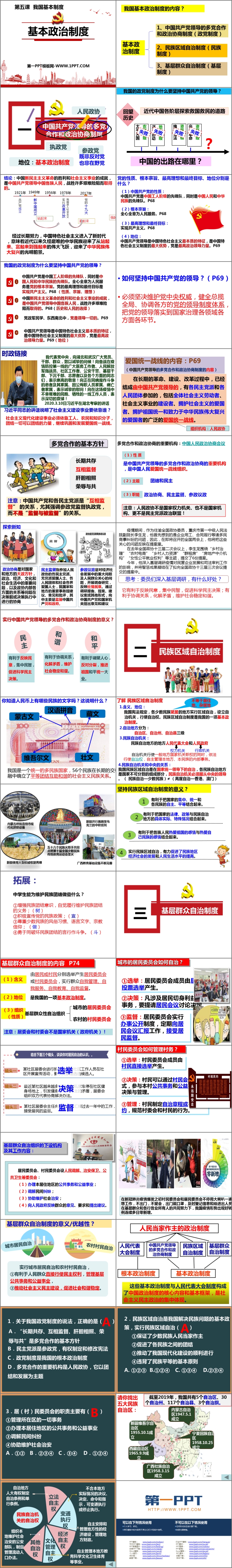《基本政治制度》PPT课件包含中国共产党领导的多党合作和政治协商制度、民族区域自治制度、基层群众自治制度、课堂练习等内容。