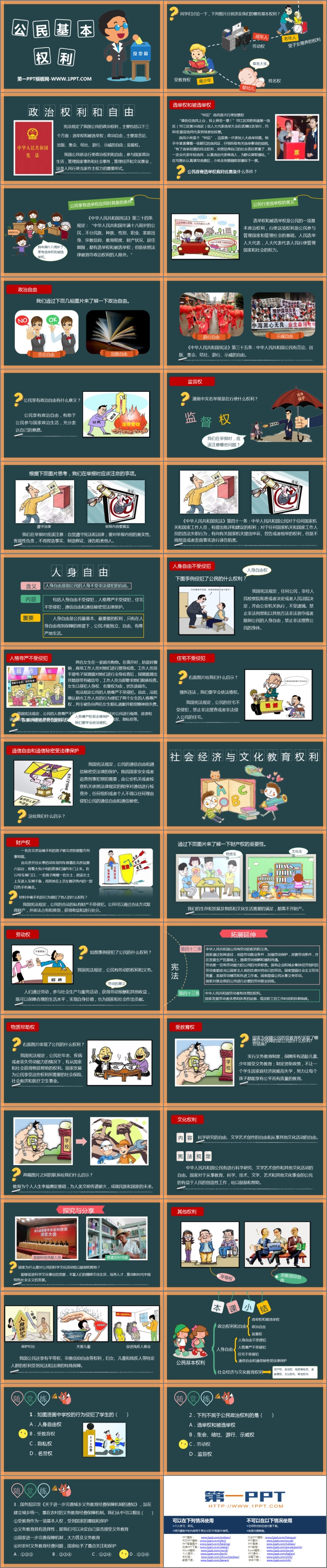 《公民基本权利》PPT课件包含政治权利和自由、人身自由、社会经济与文化教育权利、本课小结、随堂练等内容。