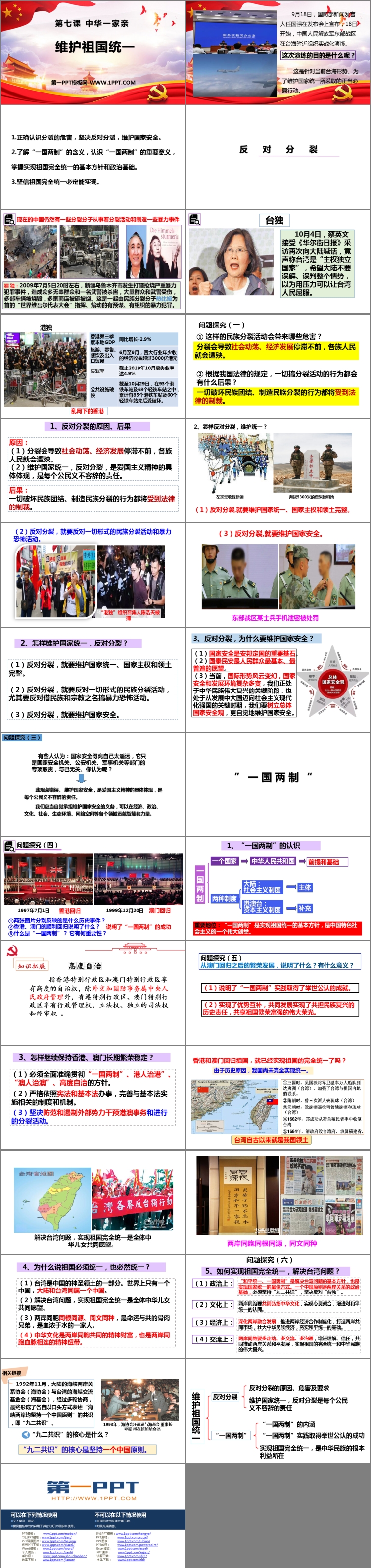 《维护祖国统一》PPT课件包含反对分裂、一国两制、课堂小结等内容。