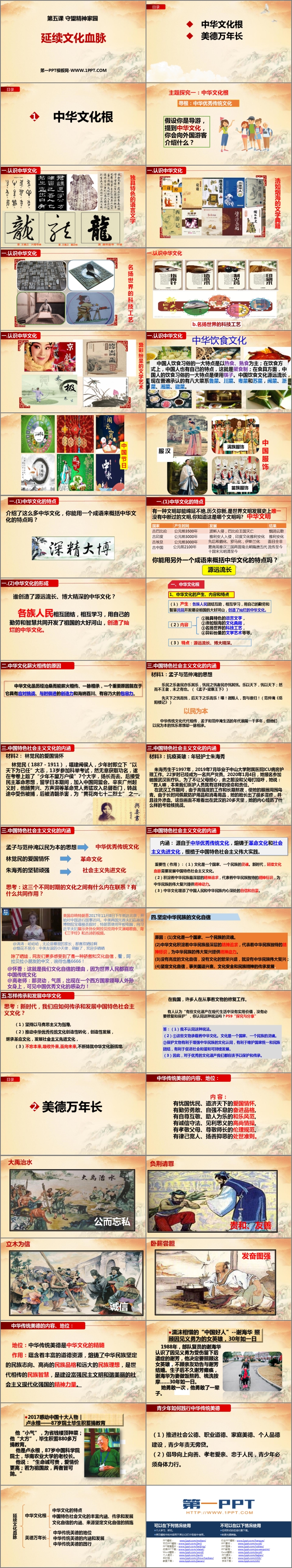 《延续文化血脉》PPT课件包含中华文化根、美德万年长、课堂小结等内容。