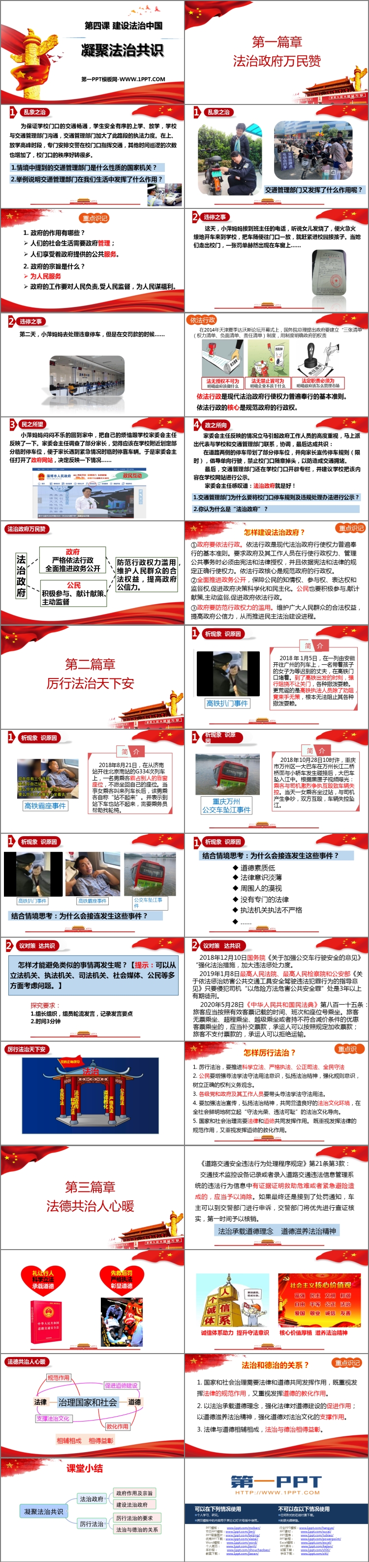 《凝聚法治共识》PPT课件包含法治政府万民赞、厉行法治天下安、法德共治人心暖、课堂小结、小结等内容。