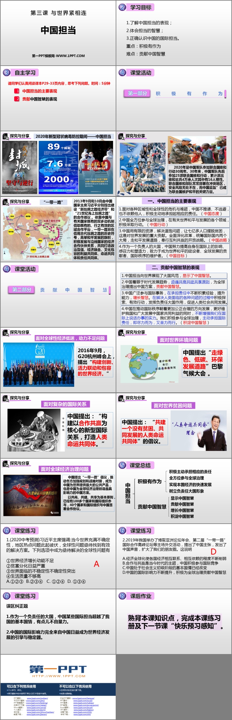 《中国担当》PPT课件包含学习目标、自主学习、课堂活动、课堂总结、课堂练习、课后作业等内容。