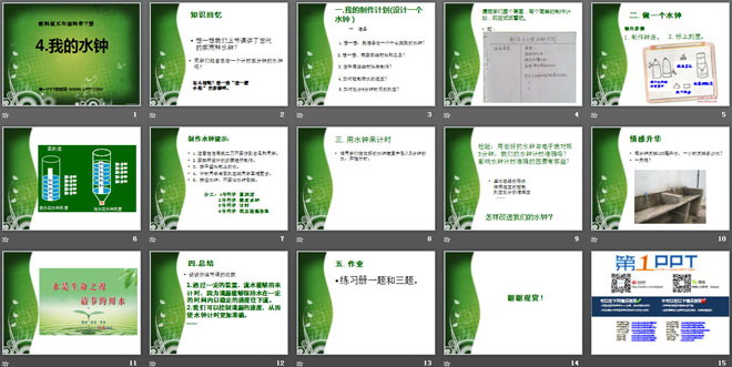 关键词:时间的测量教学课件,我的水钟教学课件,教科版五年级下册科学PPT课件下载,五年级科学幻灯片课件下载,时间的测量PPT课件下载,我的水钟PPT课件下载,.PPT格式;