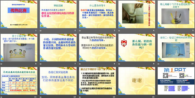 小结:不同的材料传递热量的快慢不同,金属材料传递热量比较快,塑料和木头等材料传递热量比较慢。