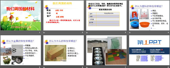 关键词:我们周围的材料教学课件,教科版三年级上册科学PPT课件下载,三年级科学幻灯片课件下载,我们周围的材料PPT课件下载,.PPT格式;