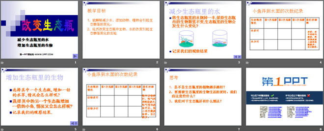 关键词:生物与环境教学课件,改变生态瓶教学课件,教科版五年级上册科学PPT课件下载,五年级科学幻灯片课件下载,生物与环境PPT课件下载,改变生态瓶PPT课件下载,.PPT格式;