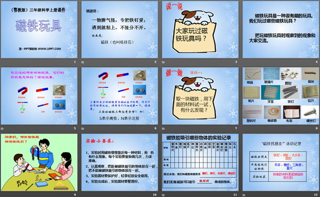 关键词:身边的玩具教学课件,磁铁玩具教学课件,鄂教版三年级上册科学PPT课件下载,三年级科学幻灯片课件下载,身边的玩具PPT课件下载,磁铁玩具PPT课件下载,.PPT格式;