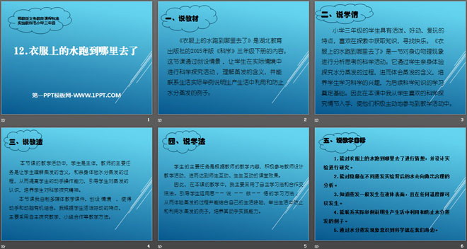关键词:衣服上的水跑到哪儿去了教学课件,鄂教版三年级下册科学PPT课件下载,三年级科学幻灯片课件下载,衣服上的水跑到哪儿去了PPT课件下载,.PPT格式;
