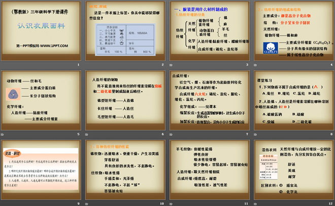 关键词:认识衣服面料教学课件,鄂教版三年级下册科学PPT课件下载,三年级科学幻灯片课件下载,认识衣服面料PPT课件下载,.PPT格式;
