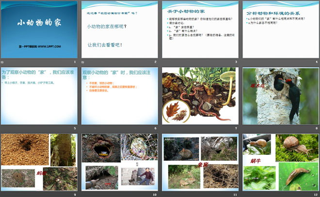 关键词:寻访校园里的动植物教学课件,小动物的家教学课件,鄂教版四年级上册科学PPT课件下载,四年级科学幻灯片课件下载,寻访校园里的动植物PPT课件下载,小动物的家PPT课件下载,.PPT格式;