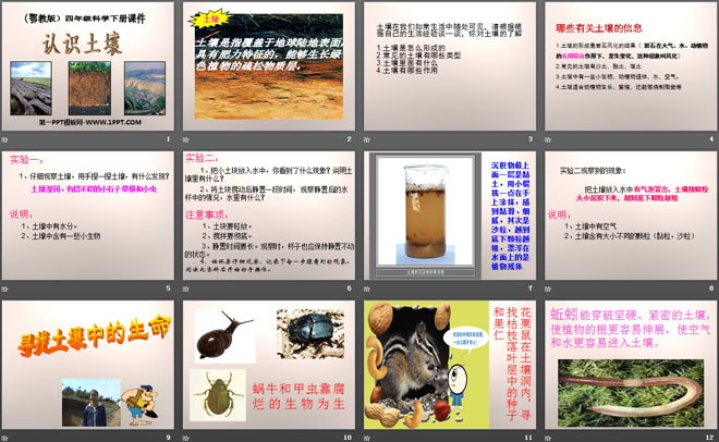 关键词:认识土壤教学课件,鄂教版四年级下册科学PPT课件下载,四年级科学幻灯片课件下载,认识土壤PPT课件下载,.PPT格式;
