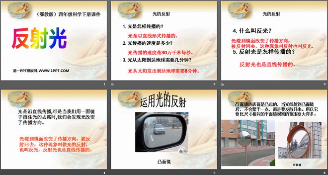 关键词:反射光教学课件,鄂教版四年级下册科学PPT课件下载,四年级科学幻灯片课件下载,反射光PPT课件下载,.PPT格式;