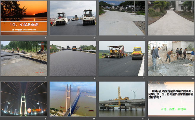 刚才我们看见的是修路架桥的画面,同学们想一想,修路架桥通常要用到哪些材料呢?