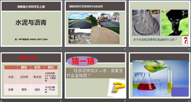 关键词:公路教学课件,水泥与沥青教学课件,鄂教版五年级上册科学PPT课件下载,五年级科学幻灯片课件下载,公路PPT课件下载,水泥与沥青PPT课件下载,.PPT格式;