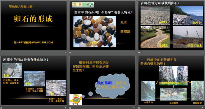 关键词:地面形态的变化教学课件,卵石的形成教学课件,鄂教版六年级上册科学PPT课件下载,六年级科学幻灯片课件下载,地面形态的变化PPT课件下载,卵石的形成PPT课件下载,.PPT格式;