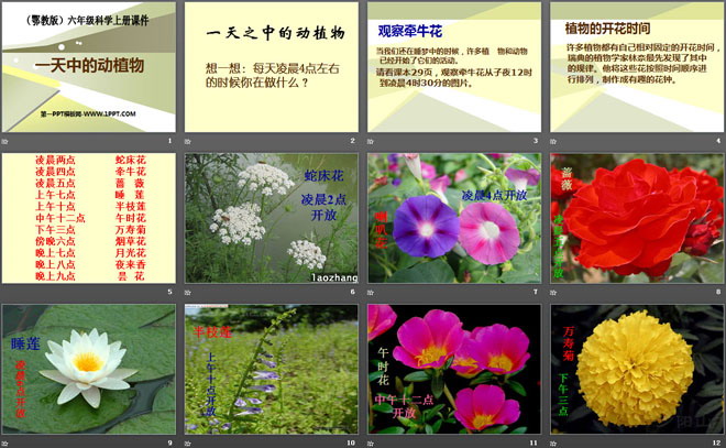 关键词:地球上的一天教学课件,一天中的动植物教学课件,鄂教版六年级上册科学PPT课件下载,六年级科学幻灯片课件下载,地球上的一天PPT课件下载,一天中的动植物PPT课件下载,.PPT格式;