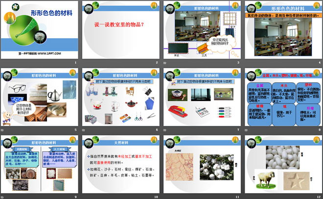 2.人们把像棉花这样,直接来自大自然的材料叫做天然材料;像塑料这样,由人类合成制造的材料叫做人造材料。