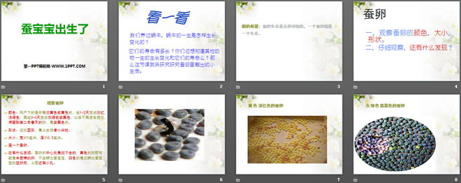 关键词:我们来养蚕教学课件,蚕宝宝出生了教学课件,湘教版三年级下册科学PPT课件下载,三年级科学幻灯片课件下载,我们来养蚕PPT课件下载,蚕宝宝出生了PPT课件下载,.PPT格式;