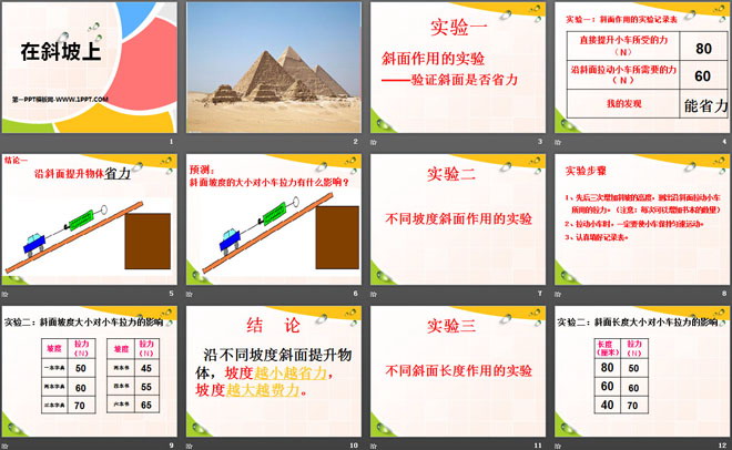 2、沿不同坡度斜面提升物体,坡度越小越省力,坡度越大越费力。