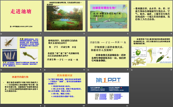 关键词:湘教版六年级上册科学PPT课件免费下载,走进池塘PPT课件,.PPT格式;