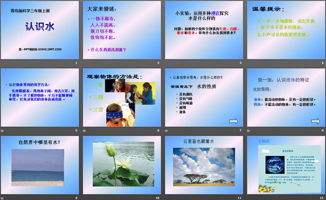 关键词:青岛版三年级上册科学PPT课件免费下载,认识水PPT课件,.PPT格式;