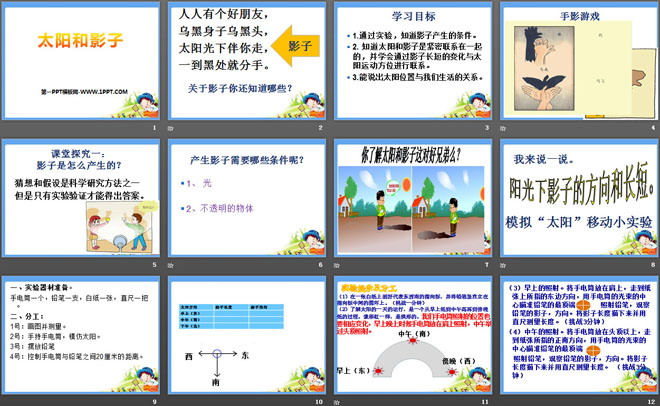 2.知道太阳和影子是紧密联系在一起的,并学会通过影子长短的变化与太阳运动方位进行联系。