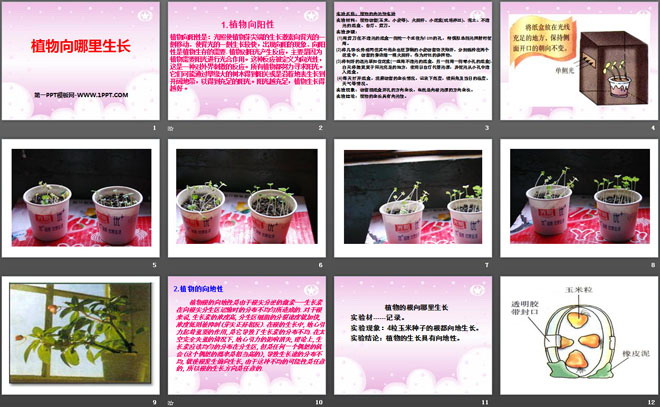 通过对比实验,根据研究结果得出结论:影响植物生长出现上述现象的确与阳光、水和地球引力有关。即:植物的向光性、向地性、向水性,是植物的生长反应。