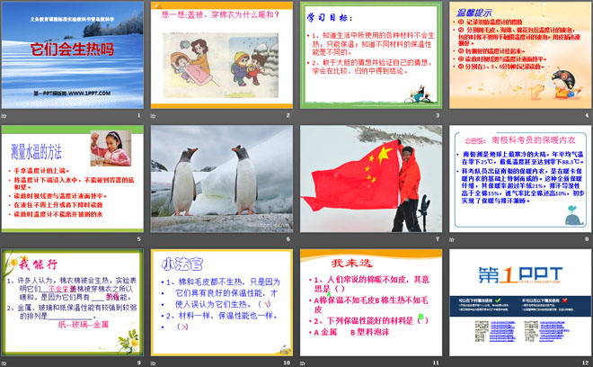 1、知道生活中所使用的各种材料不会生热,只能保温;知道不同材料的保温性能是不同的。